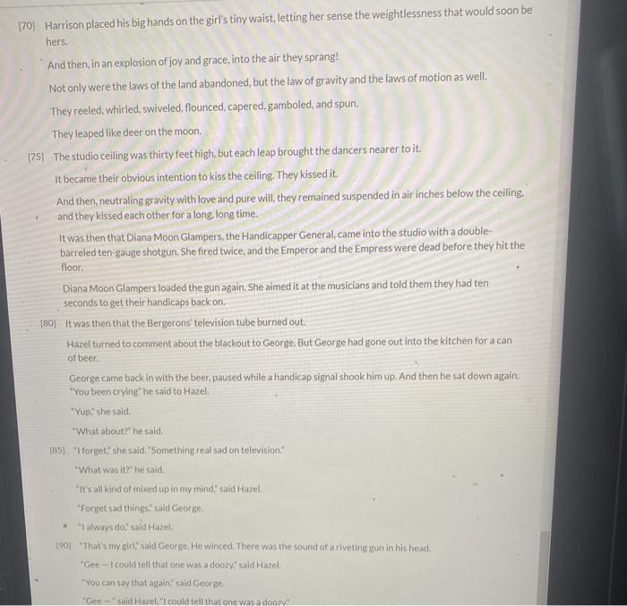 Harrison bergeron by kurt vonnegut, jr. In harrison bergeron the people were equal accordingly to their own specific handicapping. The minute people start cheating on laws, what do you think happens to society? Harrison bergeron questions and answers. Get the summaries, analysis, and quotes you need.
